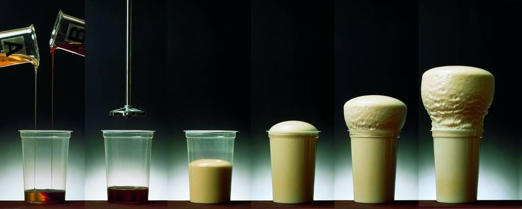 Ключевые составляющие полиольных компонентовГлавной составляющей компонента «А» является вспениватель. С точки зрения химии в качестве пенообразующего агента могут использоваться фреоны (хладоны) или вода. Вода имеет пенообразующую способность, но при этом меняет соотношение составляющих «А» и «Б» с 1:1,1 до 1:1,4–1,6. В случае использовании воды в качестве вспенивателя при соотношении 1:1,1 получается усадка пены, что связано с нехваткой изоцианатных групп для образования уретановых связей. Поэтому соотношение увеличивают до 1:1,4–1,6 с целью получения изделий методом заливки. Для нанесения полипеноуретана методом напыления пропорции могут доходить до 1:1,8 чтобы получить пену с хорошей адгезией к поверхности и нужной плотности. |